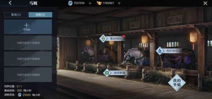 马厩:马厩等级提高,不仅可以同时饲养多匹坐骑,而且还能对坐骑进行备战编队、伯乐相马,增加坐骑的属性收益和特质资质,武将搭配坐骑后也能增加战力,具有立竿见影的增益效果。