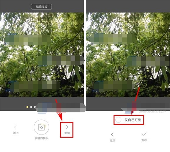 3、模板滤镜等都设置好,点击【继续】,在最后发布的页面,把【仅自己可见】一项勾选上即可私密发布。