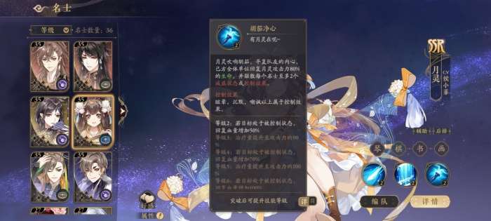 打法思路:月灵ssr(解控回血)。建议丢前排,快速回怒达到多次净化回血效果,以免洛凌尘被降攻,被控。其次还有一个复活技能,在没有好用的ur卡或没资源培养ur卡的最佳人选。