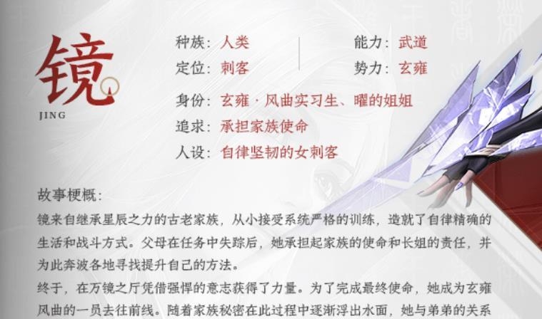王者荣耀英雄镜是曜的姐姐,定位是一位法术刺客,拥有4个技能,操作难度较高,那镜的技能是什么呢?下面一起来看下吧。