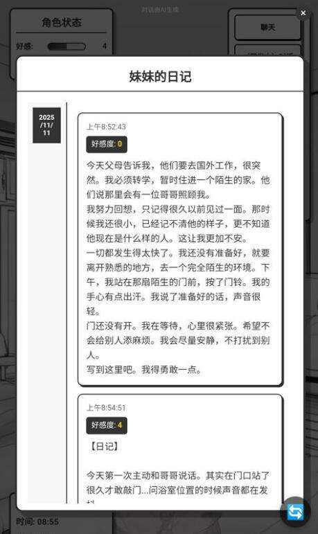 整个游戏画面的右上角那本妹妹的日记其实是很多玩家想要查看的,要说在这里全部都是妹妹内心的悄悄话,玩家想要打开的话,直接在界面就可以看到,这里会有妹妹所写下的每一段心事。比如,他因为父母突然要去国外工作而失眠,站在陌生的家门口,手心还在冒汗,这时候按门铃都害怕惊扰了玩家,后来主动的去找玩家问相关的问题。而妹妹会偷偷地记下,哥哥没有不耐烦,给他耐心的指路。