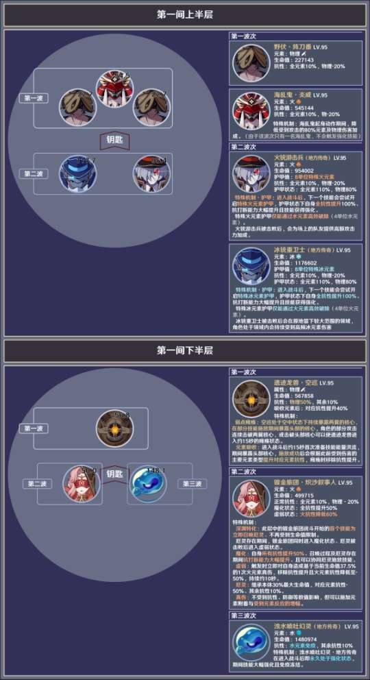第一间:共两个波次,均为对群,第二波次的敌人有特殊火元素护甲(只能通过水元素高效破除)与特殊冰元素护甲(只能通过火元素高效破除);火元素护甲需要携带水元素角色破除,冰元素护甲除携带火元素角色外,也可以利用火护甲通过风元素角色的扩散反应或染色机制破除。