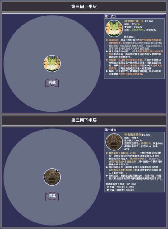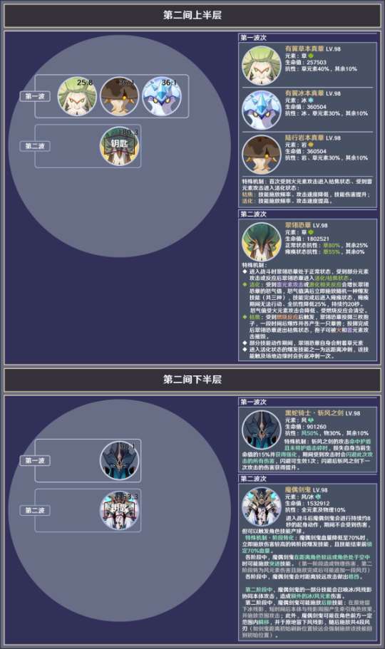 第二间:共两个波次,均为对单,第一波次的敌人有额外风元素抗性与命中护盾强化的机制、第二波次有长距离位移技能。