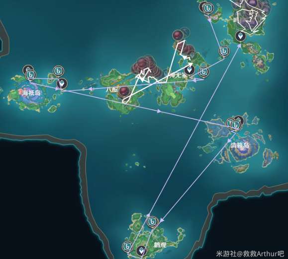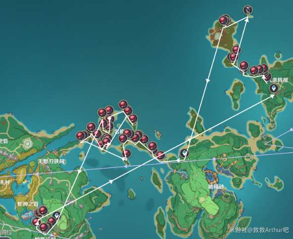 路线9为飞蝇假饵合成材料采集路线(马尾及绯樱绣球全收集)