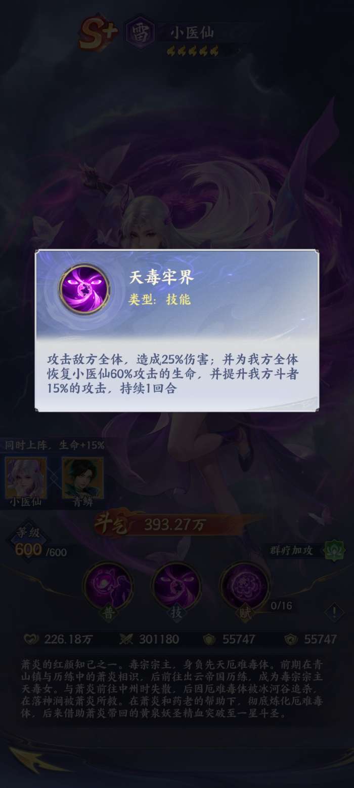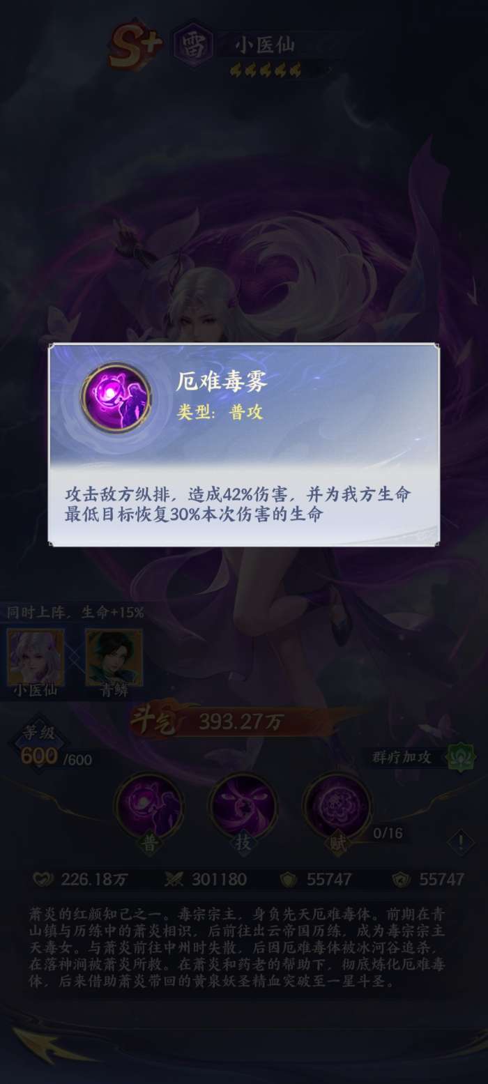 小医仙在斗破苍穹手游当中作为群疗加攻击类型的辅助,它其实又被定义为治疗跟输出增益,所以说玩家在合理利用小医仙的时候,首先需要了解他的普通攻击技能,那就是厄难毒雾。如果当小医仙已经成功的施展了这个技能之后,它可以有效地攻击敌人的纵排。并且此时此刻他还能够给自己队友最低的生命值起到回血的作用。