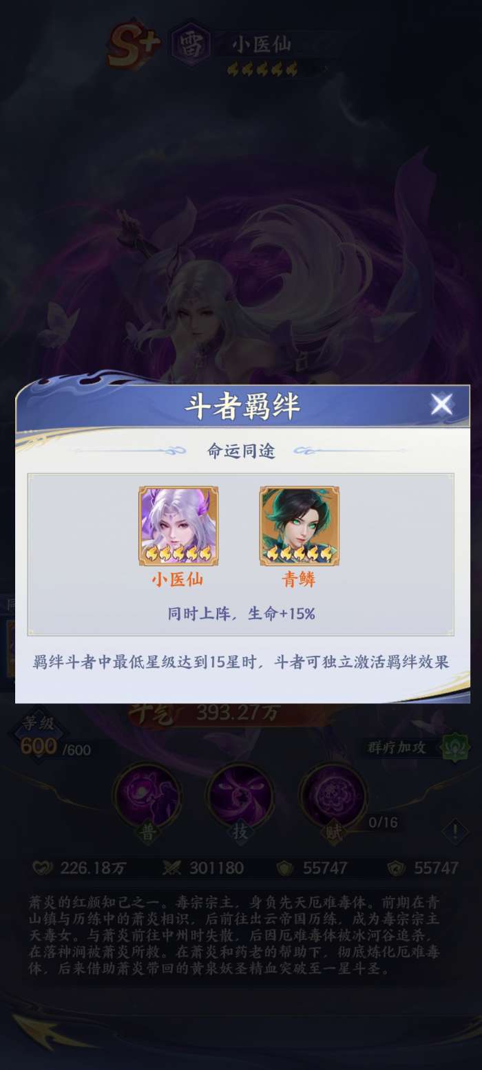 小医仙其实跟青鳞能够形成羁绊效果。如果这两者的直接搭配在一起的话,可以有效地提高生命加成。在这样的情况下,相信很多玩家发现它其实能够有效地提高生存能力。此时玩家在搭配阵容的时候,如果选择在PVE当中,小医仙这时候能够起到治疗保障的作用,攻击的话直接选择双C,而药老能够起到减伤的作用。对于玩家来说,小医仙也能够直接搭配在PVP的阵容当中。