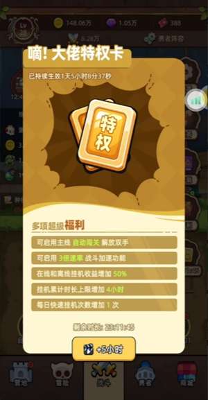 战斗闯关:就开着特权卡,无脑挂机,推关就好了,打不过就沉淀一下,强化强化装备,搭配下套装,升级勇者,和勇者技能,没事挂会机,收收菜就好了,还是很佛系的。