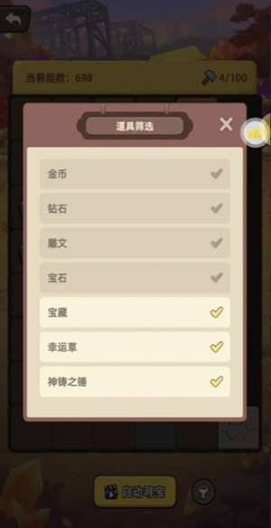 秘宝洞窟:里面只需要设置只用勾选宝藏、幸运草、神铸,然后广告自动挖宝就行了,还是很便捷的。