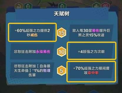 巨熊之灵是前期不弱、中期强势的全面型英雄。被动攻击附加易伤,大招提升攻速与攻击力且不消耗易伤。推荐大招易伤流(天赋右右左):主拿大招与易伤,利用先手优势开局放大叠加易伤,配合灵魂捕手等金卡快速打出高额伤害,后期补生存保命。