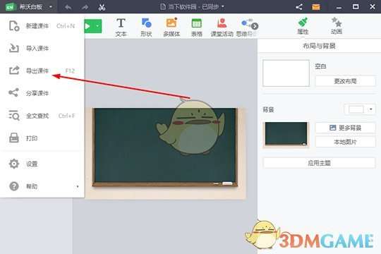 2、之后将会进入此课件内,点击左上角的希沃白板,其中的“导出课件”功能就是今天的主角,对此选项进行点击即可开始操作,如下图所示: