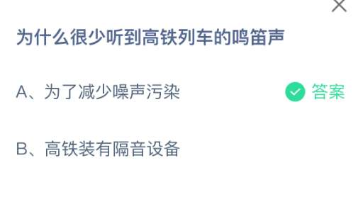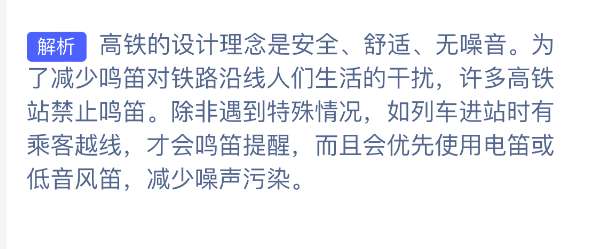 为什么很少听到高铁列车的鸣笛声?支付宝小鸡课堂开课啦!每天花一分钟答题赚饲料,喂喂小鸡就能贡献爱心啦!轻松又意义十足!2025年11月3日蚂蚁庄园的小鸡课堂题目正确答案是【为了减少噪声污染】,高铁列车鸣笛声减少的主要原因是为了减少噪声污染。随着铁路通信技术的进步,多数情况下可通过设备联络替代传统鸣笛,且多数居民区被纳入限制鸣笛区域。