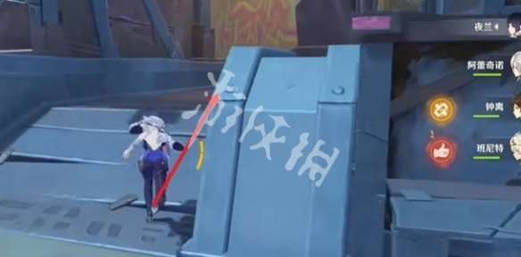 在上层边缘的红色光柱处倒下去,然后站在红色光柱上再向上跳。