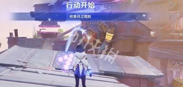 在开始挑战后,首先向前拾取前方的箭头形状的月之微粒。