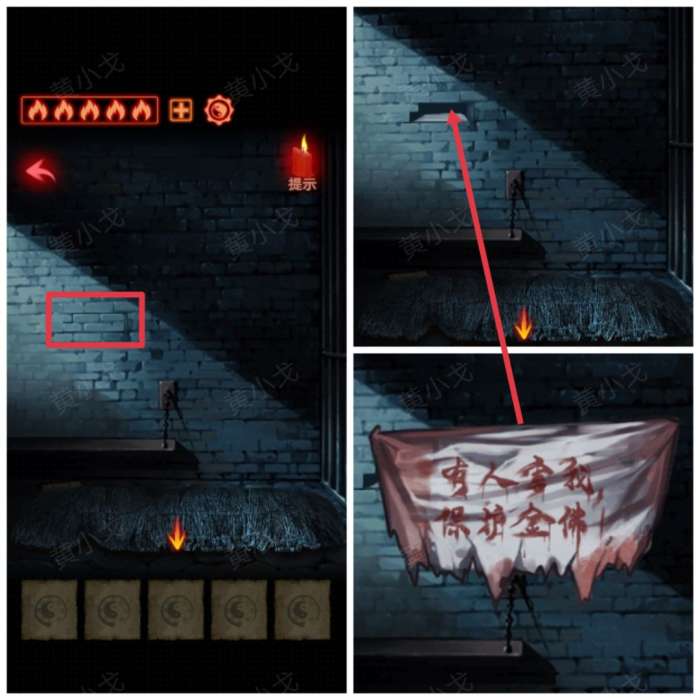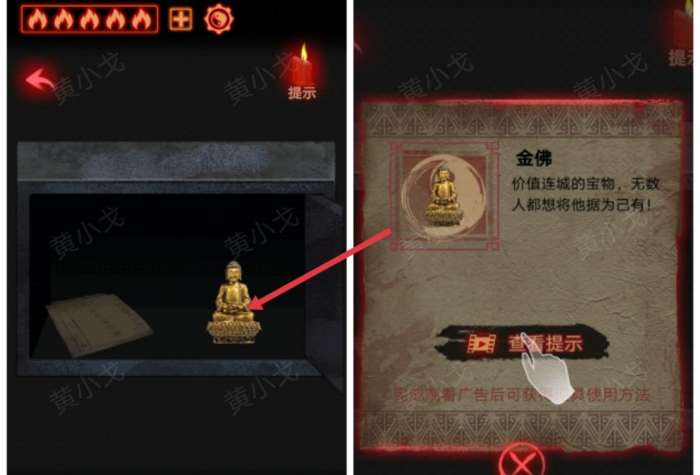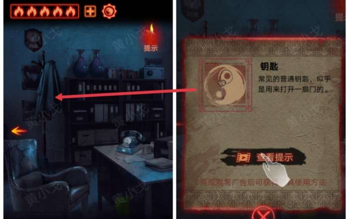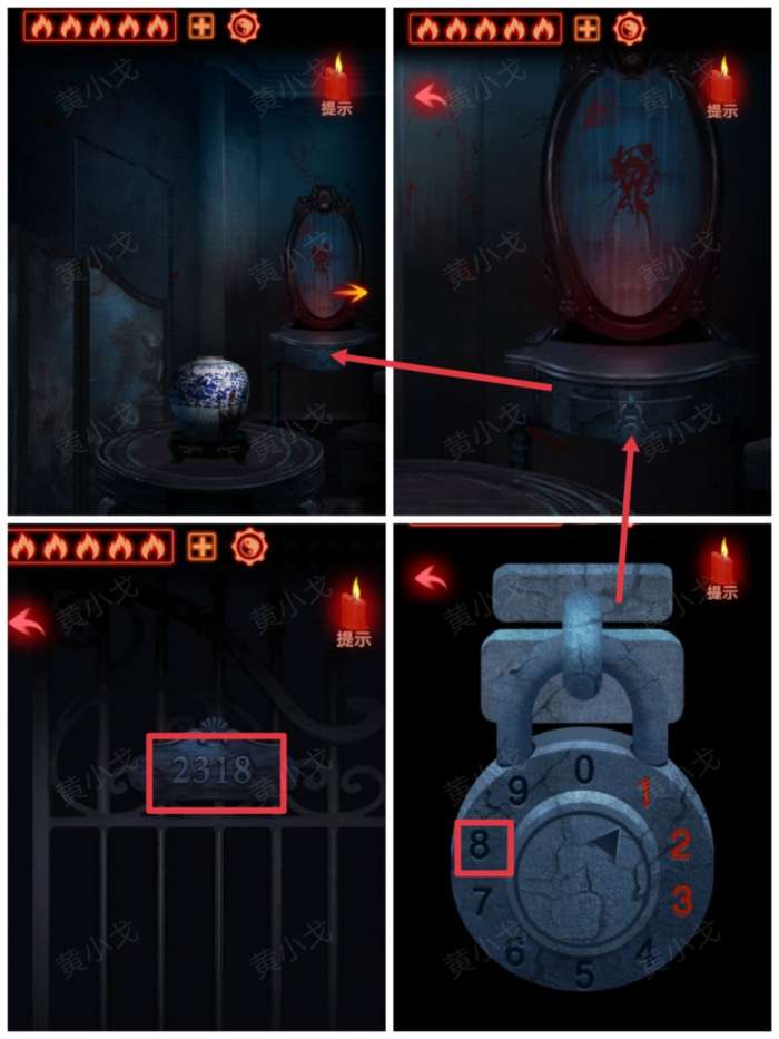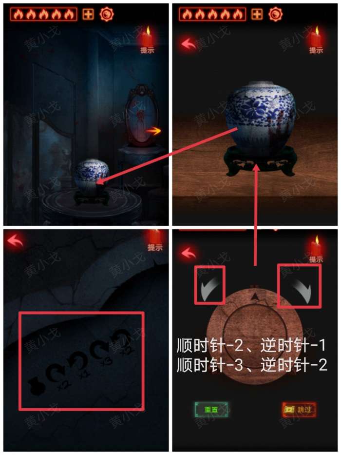 8.(钱府-暗门)点击瓶子底部机关,根据喷泉上的线索,按顺序和次数点击按钮(顺时针2,逆时针1,顺时针3,逆时针2)。打开暗门,进入密室