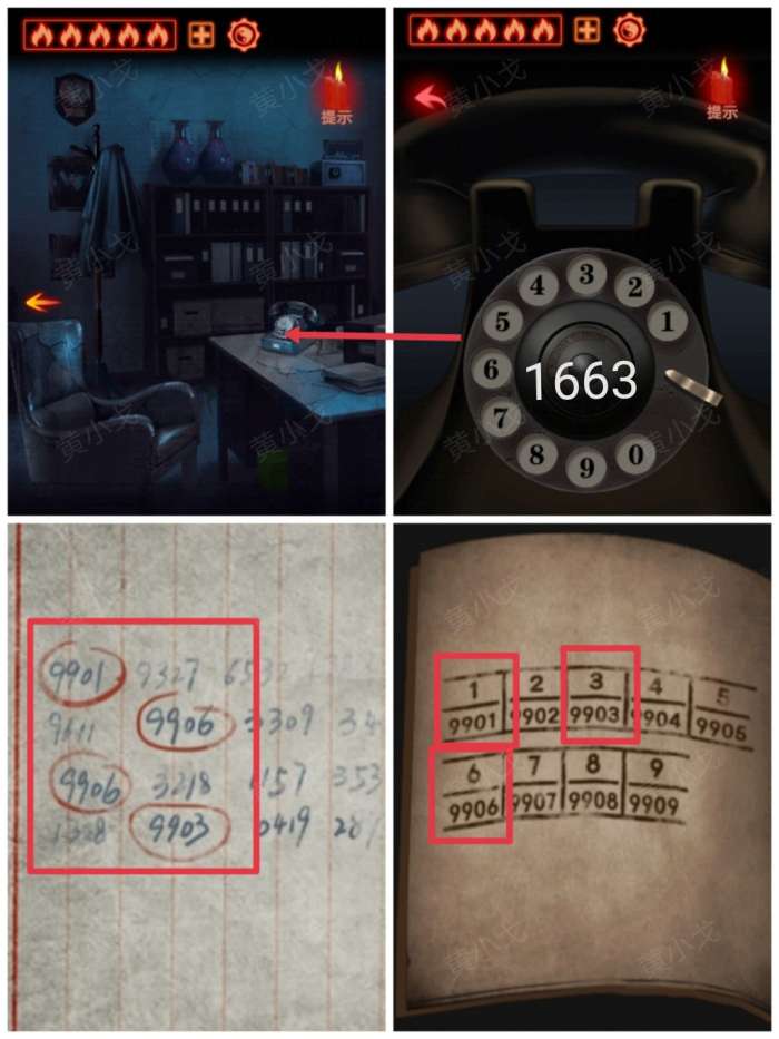 11.点击桌子上的电话机,根据人事卷宗里圈起来的数字(9901 9906 9906 9903)对照《码电报书》,拨打电话:1663