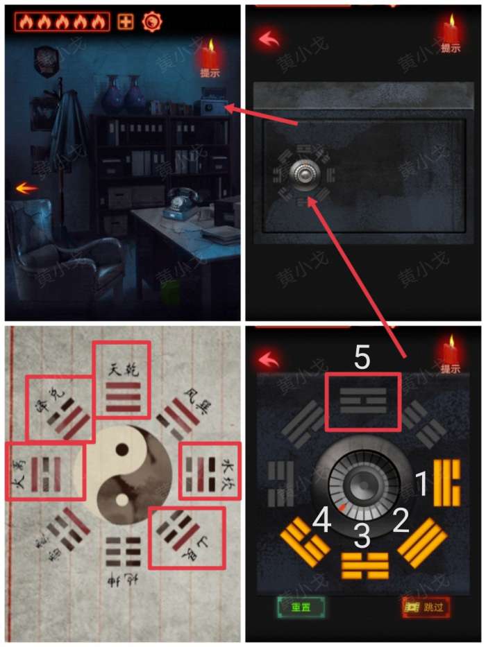 16.(警务探长室)点击档案柜上的保险箱,根据密室花瓶的线索(兑乾坎艮离)和监狱里信件上的线索,按下对应的八卦图案(短长长、长长长、短长短、长短短、长短长)