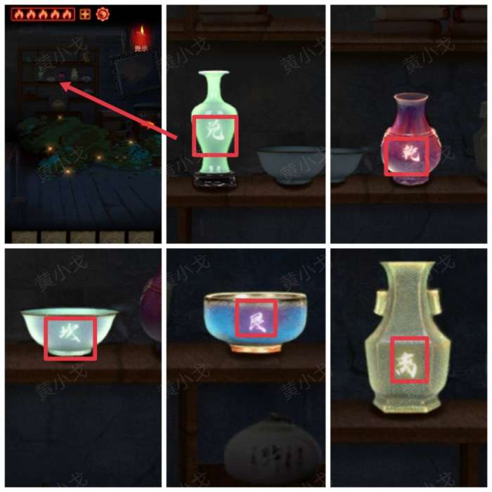 9.(密室)点击置物架,注意看花瓶亮起的顺序及花瓶上的字(兑乾坎艮离)