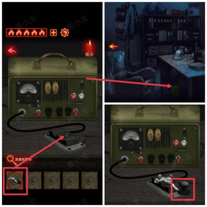 19.点击发报机,放入【发报机零件】。接收电报(短短长长长 短短短短短 短短短长长 长长长短短)