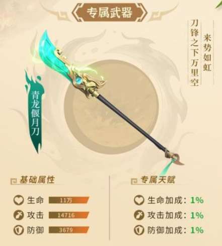 但是目前通过生病培养的话大家消耗的资源也比较多,所以在前期大家完成了更多主线里面获取到的神兵材料才会更多,比如说关羽他经常用的一个武器就是青龙偃月刀,这个神兵根据基础的属性效果上面会有带来基础的天赋加成,在生命攻击,防御这三类加成的效果当中都有1%的一个数值提升,除此之外也就是神兵的专属技能效果,根据上面说到的,他能提升的一个等级优势是传说、神话、绝世、无双这几个级别的培养,天赋可以进行提升,那么提升之后再实施级别的时候,就是根据他的路径技能带来攻击力的提升了。