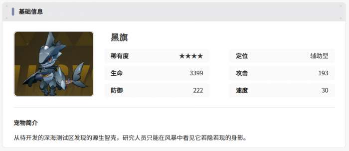 黑旗表面看起来是一个比较神秘的智壳,那么在搭配的时候,大家可以看到它更为全面性的效果,目前黑旗的强度还是比较高的,因为它的稀有度也达到了四星的能力,但是它定位是一个辅助型的智壳,所以在搭配角色上面的时候,建议大家也选择一些辅助类型的角色进行搭配,它的基础性能上面其实还是比较全面的,比如生命数值上面,以及防御属性,还有速度属性,都是基础数值就比较可观的,在速度上面基础就可以达到30点,所以在战斗里使用黑旗也可以快速的进行行动,在抢占先机的时候,大家就可以凭借这个这个速度带来足够的先机抢占能力。