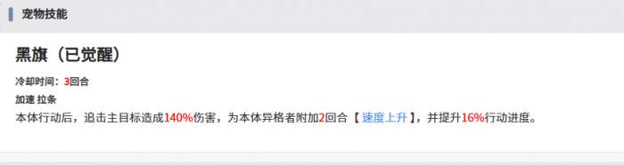 另外黑旗因为自身也具备一定的追击效果,那么在使用它作为辅助的时候,用到的主体增益也是不错的,每当角色使用完了一次行动之后,黑旗就会开始使用这个追加的效果,造成一次追加攻击一般是针对敌方的主要目标进行攻击的,造成攻击的时候,伤害最高的百分比是可以达到140%,所以这个百分比跟很多的辅助类型角色都是可以比一比的,而且黑旗同时还具备了给携带者提升的能力,此时触发提升效果的话,可以让角色在后期的两个里面度得到速度上升的增益。