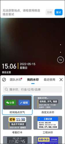 4、进入相机页面,点击“水印”,确定“日期地点水印”。