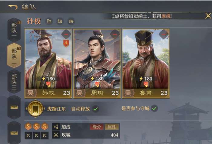 除了周瑜之外,辅助、次C角色同样重要。孙权是推荐队员之一,他的技能可以给全队提供法术增益,也可以提高周瑜技能的触发频率。合理配置孙权的控制技能保证周瑜的输出节奏稳定,在持续战斗中维持较高的伤害输出。鲁肃是第三个成员,起辅助、控制的作用。技能机制增加火焰状态的持续时间,给团队增加智力属性,使周瑜和孙权形成完整的输出联动链。而三位武将组合在一起,燃烧弓的阵容既有高爆发又有持续输出。