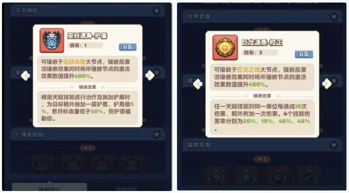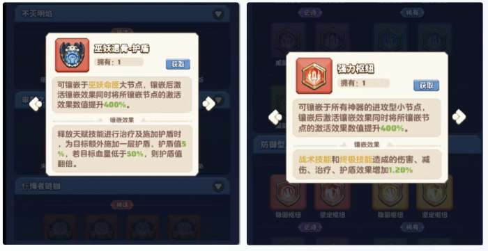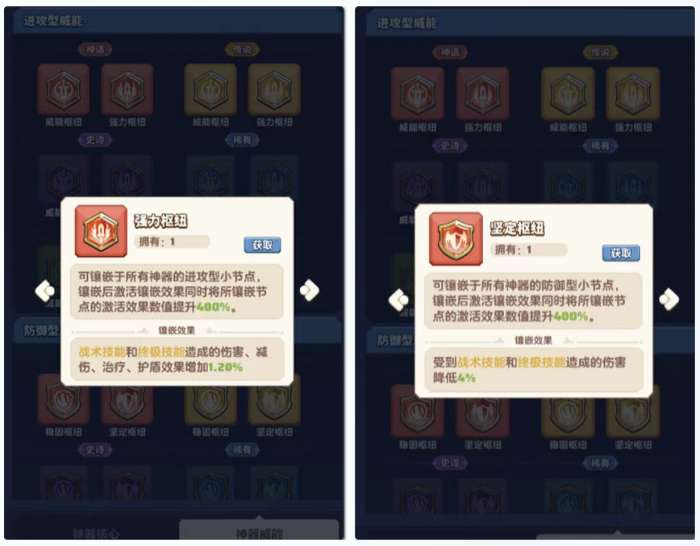 节点激活后会解锁神器威能或神器核心的镶嵌槽位。神器威能和神器核心不但可以提供高额的数值加成,还可以促进天赋的再觉醒。具体增益效果视神器威能和神器核心的品质而定,品质越高增益越强,共有绿、蓝、紫、金、红五种品质。