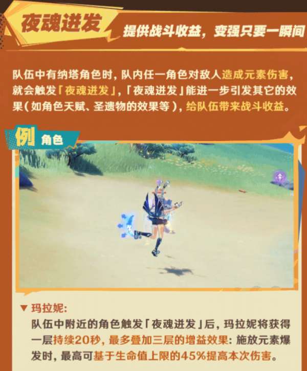 当队伍中拥有纳塔角色时,任何角色对敌人造成元素伤害时,都会触发夜魂进发效果。夜魂进发能够进一步引发其他效果,如角色的天赋技能和圣遗物属性等,能够为队伍带来战斗收益。