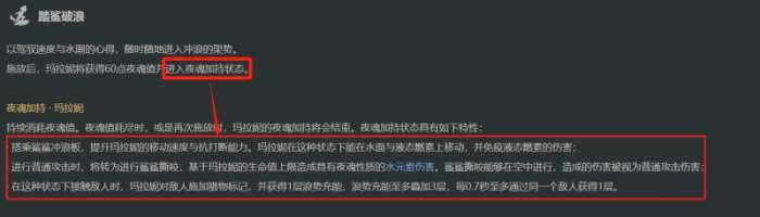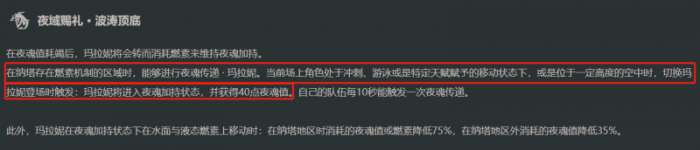 当在存在燃素机制的区域中时,可以使用夜魂传递·玛拉妮。如果当前角色处于冲刺、游泳或者特定天赋赋予的移动状态下,或者处于一定高度的空中,切换到玛拉妮登场时会触发:玛拉妮会进入夜魂加持状态,并获得40点夜魂值。