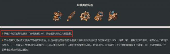 比如新的圣遗物“烬城勇者绘卷”2件套的效果:队伍中附近的角色触发”夜魂迸发”时,装备者恢复6点元素能量。