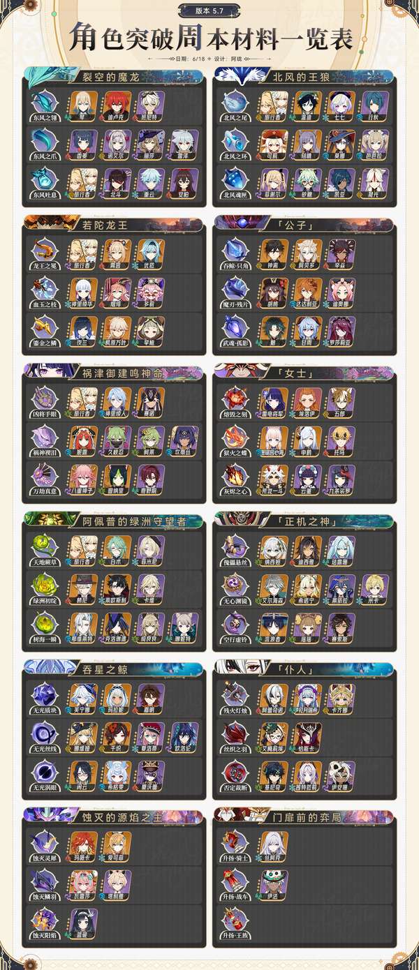 各位旅行者大家好吖,本次带来「5.7版本」天赋&周本材料一览表。