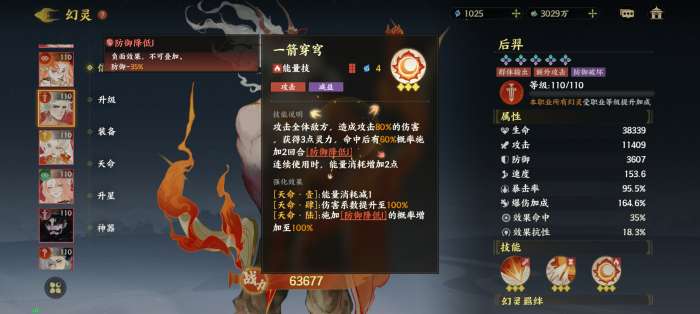 后羿作为输出,强大在有着固定伤害,不会受到克制影响,他的普攻会攻击一名敌人造成80%伤害,并获得1点灵力,若灵力到5点会消耗掉全部,发动一次“一箭穿穹”的额外攻击,他的回合技会攻击全体敌人,造成60%伤害获得2点灵力,并且自身得到2回合的攻击提升,他的“一箭穿穹”会攻击全体敌人,造成80%伤害获得3点灵力,成功命中有60%概率施加2回合防御降低。