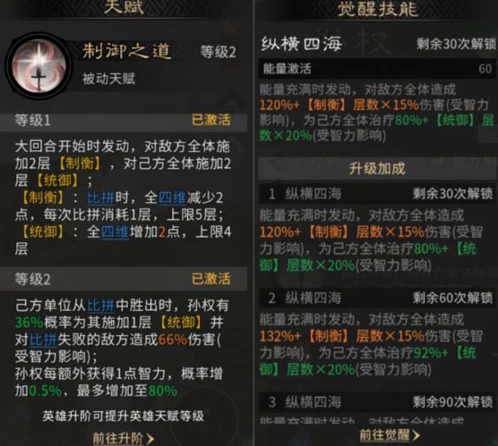 三国天下归心孙权技能怎么样,孙权的觉醒技能【纵横四海】,为全体AOE+全体体治疗。该技能数值是动态成长的。战斗回合越久,孙权通过天赋施加的【制衡】(敌方身上的Debuff)和【统御】(己方身上的Buff)层数越多,觉醒的伤害和恢复量就越高。