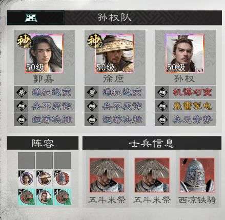 则在每次比拼胜出后,造成伤害并概率施加【技穷】或【牵制】,并能连续触发效果,快速激活觉醒技【一言不发】以打出高额伤害及控制。孙权提供全面的四维属性加成,进一步扩大拼点优势。内战时尤其克制如郭嘉、徐庶、诸葛亮队。