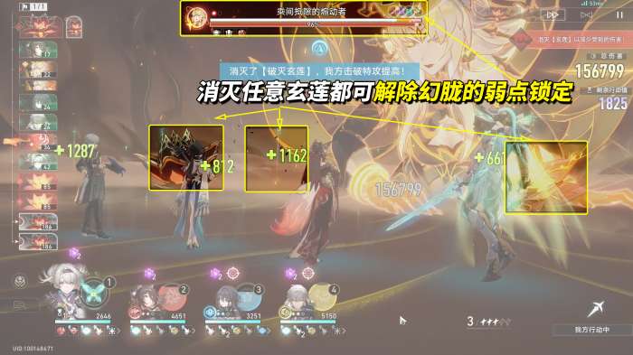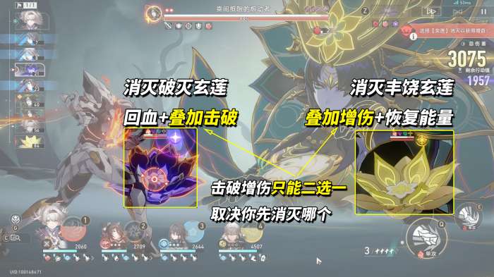 对局中,消灭左侧破灭玄莲恢复血量并叠加击破,消灭右侧丰饶玄莲恢复能量并叠加增伤。注意,击破与增伤只能二选一,取决于你最先消灭的玄莲类型!