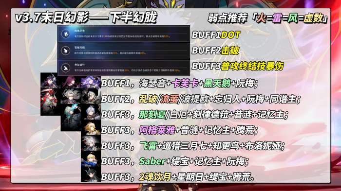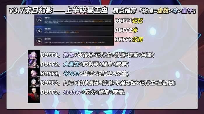 【推荐阵容】BUFF1记忆命途角色越多易伤越高、BUFF2给50%冰增伤与10%速度、BUFF3施放终结技给1回合的50%暴伤50%弱点击破效率。