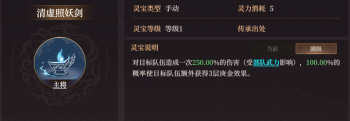 灵宝【清虚照妖剑】满级造成一次250%的伤害,并额外附加3层庚金,提升敌方受到的武力伤害。因此云中子在开荒期阵容选择很灵活。除了双修阵容外,还可以搭配韦护+张奎/其他庚金叠层工具人玩庚金骑。