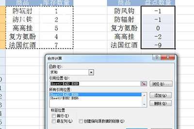 这样盘点数量就暂时变为负数啦。再在【数据】选项卡里找到【合并计算】。然后分别将两个数据区域添加进来,并将下方标签位置勾选为【最左列】。