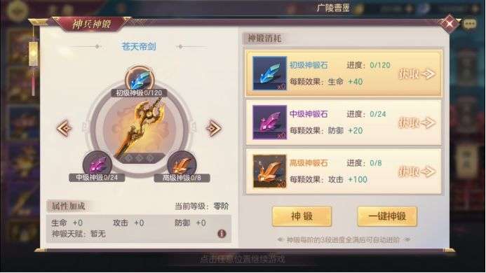 通过消耗神锻石可以进行神兵神锻,神锻小节点可获得基础属性加成,大节点变化后将会获得强力天赋或技能强化,神兵神锻阶数上升后会减少神兵技能冷却的回合数以及技能基础消耗的气势,这个在战斗中非常的重要哦!