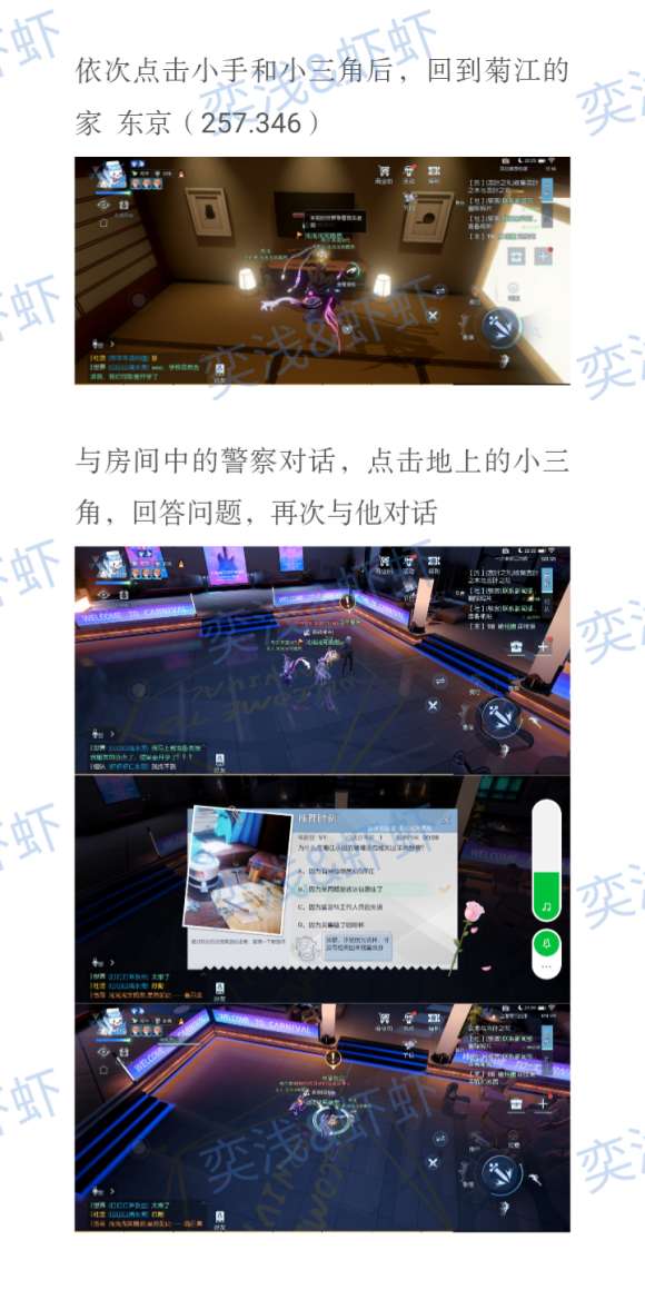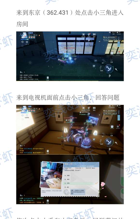 这时剧情我们怀疑是助理下毒 为寻找原因要我们找到助理的家进屋调查 助理家在东京房产处旁边 地图右边寻找东京房产就可以找到 坐标是在【东京(362.431)】 进屋到达电视机前面点击小三角 回答问题 答案为【270】