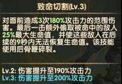 核心技能,3次大范围x轴aoe伤害,最后一击百分比生命+回血,并使敌人无法恢复生命值,消耗骨鞭