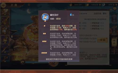 镇世灵灯的效果是对敌方全体造成38%的伤害,如果对方不足6人每少一个伤害增加10%,最高叠加50%。升星的话会额外增加每少一个伤害增加的百分比伤害和叠加次数。