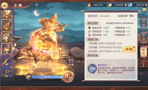 镇世灵灯的初始加成为全体生命+900;全体攻击+150;全体防御+90,比起橙色神兵的全体生命+3000;全体攻击+500;全体防御+300差距还是很大的。