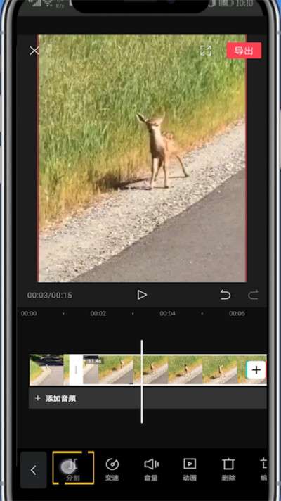 5、再将光标滑动至剪辑部分的结尾点击分割