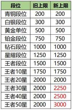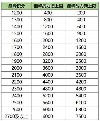 1、调整了巅峰赛各分段所能获取的荣耀战力上限分布(改动如图所示),目标是减少在巅峰前中期对应分段时,打满上限所需的场次,使玩家更聚焦于巅峰积分的提升。