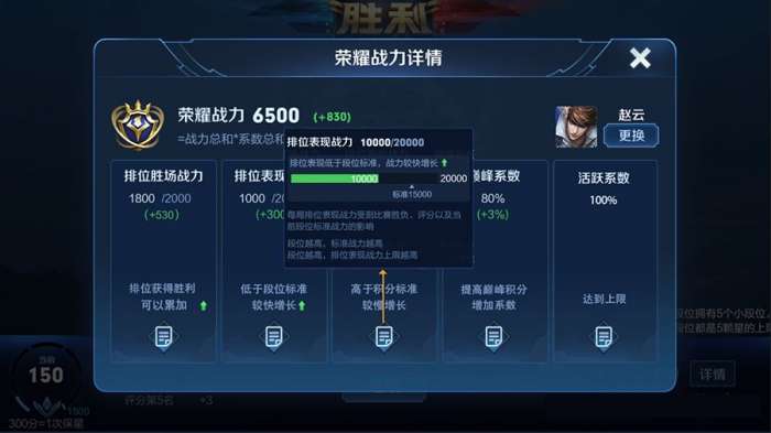 但当【排位表现战力】高于所处段位的标准战力或者达到了该段位能够获取的战力上限时,就会提示召唤师此时继续使用这个英雄时胜利增加的战力将会变少甚至不再增加战力,此时召唤师就需要提升段位,在更高水平的对局中去证明自己了。