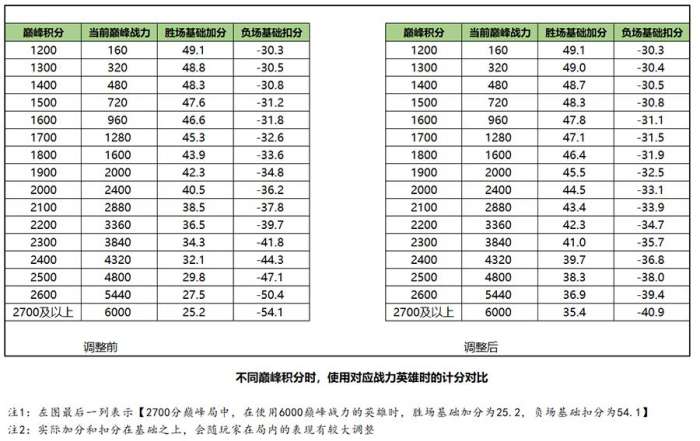 需要说明的是,这里的“胜场加分”和“负场扣分“是位于巅峰积分对应平均战力时的基础值,同时还受到个人表现的影响,当前战力高于巅峰积分对应的平均战力时,也会有所调整。