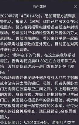 犯罪大师crimaster游戏中的7月14日更新的突发案件白色死神的四凶兽大家都找了吗?下面小编就跟大家分析一下这个案件的答案吧。