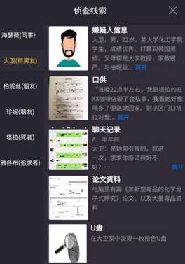 嫌疑人:海瑟薇(同事)、大卫(前男友)、柏妮丝(朋友)、珍妮(朋友)、雅各布(追求者)。